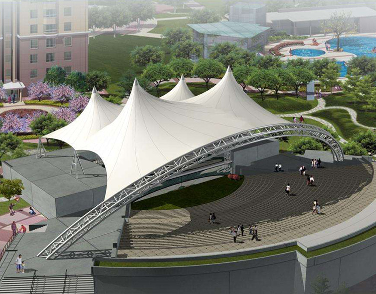 2、膜結構景觀小品在環境中審美功能是它的屬性,它通過造型、色彩、材質、肌理向人們展示其形象特征,同時也包含著一定的文化內涵。景觀膜結構的文化性體現在地方性和時代性當中,它的創造過程就是對這些文化內涵不斷升華、提煉的過程,它的文化特征反映在其形象上,結合周圍的文化背景和地域特征而呈現出不同的設計風格。